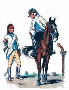 the The 3rd Continental Dragoons by Dan Murphy On January 9, 1777 under the command of Lieutenant Colonel George Baylor. A Virginian, Lt. Col. Baylor had previously served as George Washington's aide de camp and had been marked for serving with distinction at both Trenton and Princeton. The 3rd was to be composed of six troops, two to be dismounted. Assigned to Baylor's 3rd was Captain George Lewis' troop of horsemen who were already serving as General Washington's Bodyguard. Other men were recruited from Virginia and North Carolina, with eighty men coming from Francis Nash's North Carolina Brigade. But equipping and outfitting a regiment of dragoons proved to be a task that the Continental Quartermasters was not fully up to. Throughout their history the 3rd was hampered with issues of supply, and it was a constant struggle for their commanders to keep their men and horses in fighting condition. Nonetheless, elements of the 3rd Dragoons saw their first limited action at Brandywine and then Germantown before going into winter quarters at Valley Forge. Shortly after they were moved to the vicinity of Princeton, New Jersey where forage was more readily available. 1778 One of the 3rd's early successes occurred May 4th, 1778 at Cooper's Ferry, New Jersey. A force of 3rd Dragoons under Major Alexander Clough was detailed to scout a 200 man British fatigue party under the watchful eye of three British redoubts. After reconnoitering the fatigue party, Clough sent two troopers with sight of the redoubts as a decoy. A strong squad of 17th Light Dragoons came charging out in pursuit of the two decoys and Clough, in turn, charged the squad of the 17th. In the following melee, the 3rd Dragoons routed the British 17th and took four of them prisoner. More importantly to the men of Clough's command, they were allowed to sell the captured horses as prize money for 170 dollars apiece. In the coming campaign the 3rd Dragoons took a more active role and were actively engaged at the Battle of Monmouth Courthouse. After the American victory the 3rd harassed the retreating British all the way to Sandy Hook where the British were then ferried over to safety in New York City. By September, the 3rd Dragoons boasted 159 troopers and Col. Baylor, with 103 men were moved to new quarters near Old Tappan, New Jersey. On the 27th of September they received a new issue of uniforms. White coats with medium blue collar, lapels, cuff and coat tail turnbacks, polished caps of black leather, black neck stocks, medium blue waistcoats, white breeches and black boots. That very same night they were surprised by British troops under General Sir Charles Grey at 2:00 am. The night attack was carried out in total silence and the dragoon's picket was overrun before they could warn the main camp. Quartered in three separate barns, many of the other dragoons were bayoneted in their sleep, 67 dragoons were killed, wounded or captured. Among the dead was Major Clough. Lt. Col. Baylor was wounded and taken prisoner. After securing the camp, the British went on to kill 70 horses. The survivors made their way back to Middlebrook by dawn where they rejoined the other two troops who had fortunately remained there. The encounter became known as Baylor's Massacre. After the disaster, General George Washington transferred his second cousin, Major William Washington of the 4th Dragoons over to the 3rd.