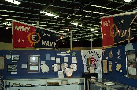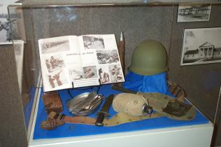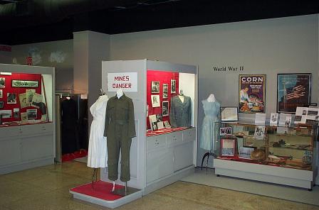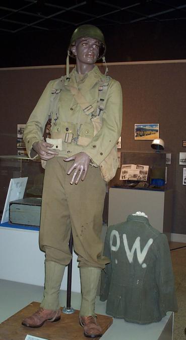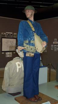 One mannequin portrays and early war trainee with blue denim fatigues,
