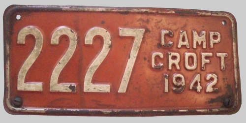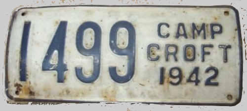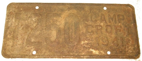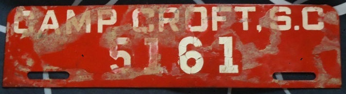 Apparently only used the first couple of years the camp was open, these are seen on the private vehicles of officers assigned to the camp. The background of the first few I had seen were dark blue but since then I have seen examples of yellow, white, and red as well. Likely this color coding denoted specific personnel but it is unknown at this time what it means. Tell us about your license plate or other memorabilia from Camp Croft!