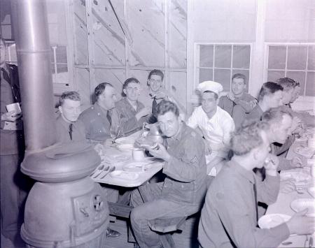 A relaxed mess hall scene ... even the cook has time to pose.